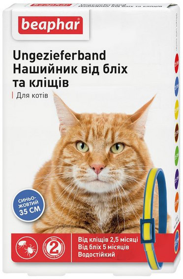 Нашийник для кішок проти бліх і кліщів синьо-жовтого кольору довжиною 35 див. Застосовують тваринам з лікувальною і профілактичною метою, при энтомозах (блохи, воші, волосоїди), хейлетиозе і ураженні іксодовими кліщами.