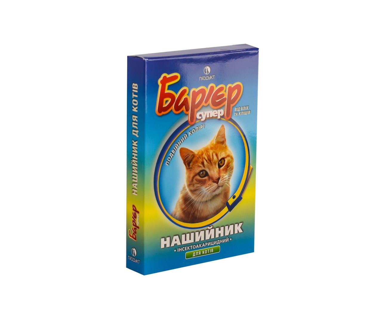 Нашийник інсектоакарицидний Бар’єр супер для котів – полімерна стрічка з фіксатором зі специфічним запахом складових компонентів.