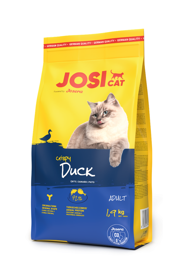 JosiCat Crispy Duck смачна їжа для котів, які люблять качку. Корм добре підходить для котів з нормальною або низькою активністю. Повнораціонний сухий корм для дорослих котів.