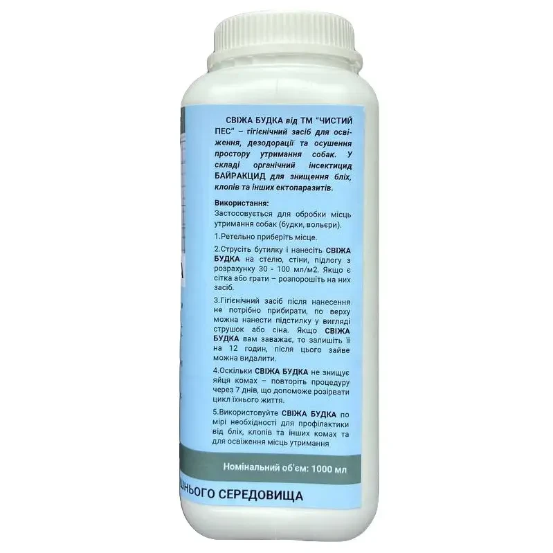 Гігієнічний засіб "СВІЖА БУДКА" від ТМ "ЧИСТИЙ ПЕС" для освіження, дезодорації та осушення простору утримання собак. У складі органічний інсектицид БАЙРАКЦИД для знищення бліх, клопів та інших ектопаразитів.