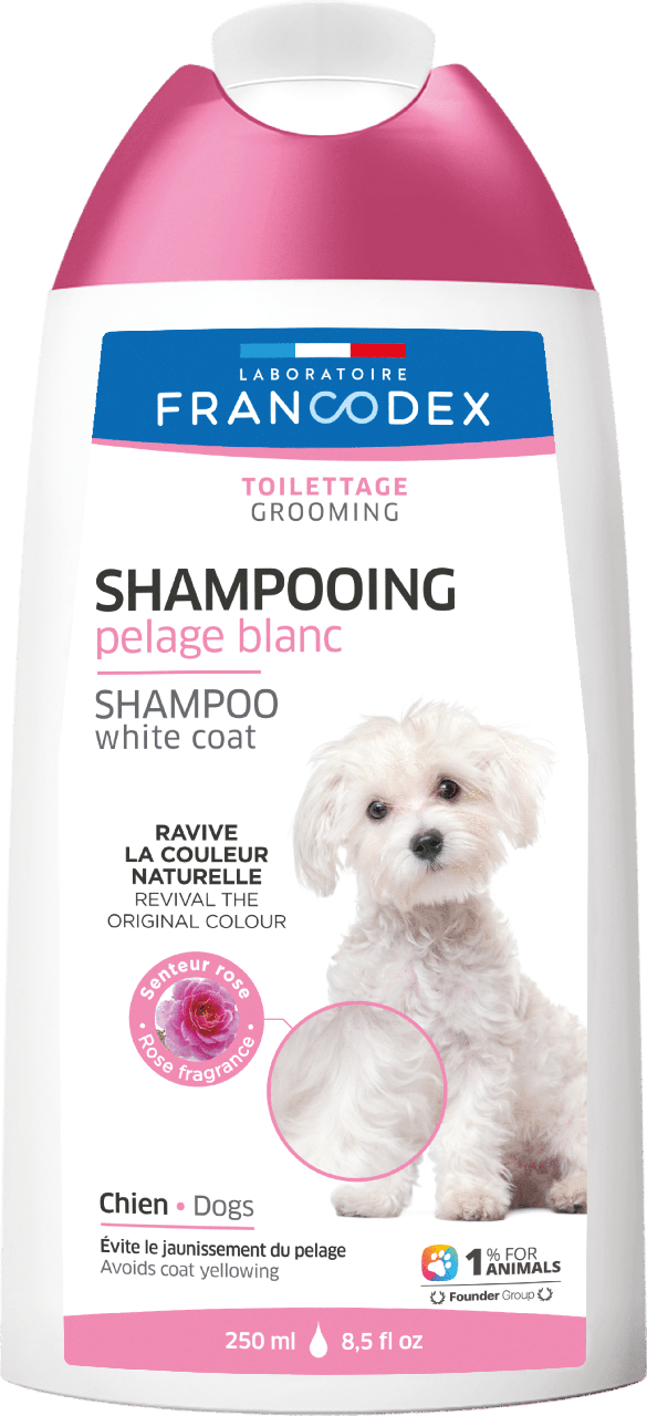 LABORATOIRE FRANCODEX WHITE COAT SHAMPOO (Шампунь для собак з білою шерстю Лаборатуар Франкодекс) підсилює природну білизну шерсті завдяки освітлюючим властивостям вітаміну B3. Синій барвник у складі шампуню зменшує пожовтіння шерсті. Шампунь має кондиціонуючий ефект та робить шерсть шовковистою та блискучою. Завдяки нейтральному pH ніжно очищує та зберігає природне зволоження шкіри навіть при частому використанні.