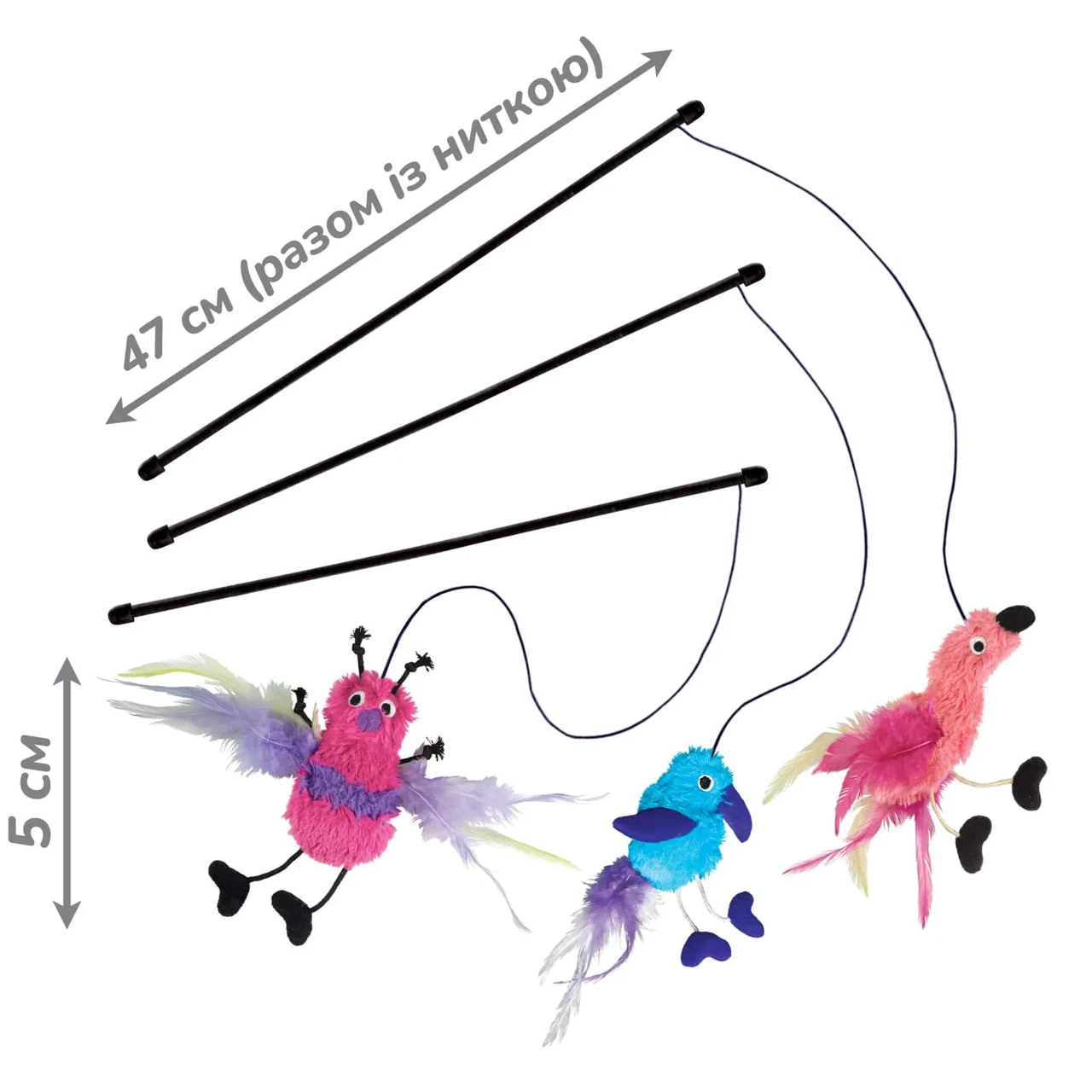 Яскраве пір’я та звук шурхотіння під час гри додатково заохочують до гри.