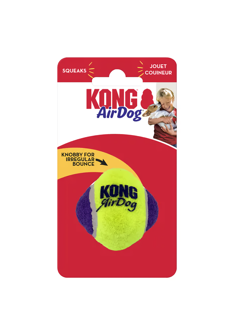 KONG AirDog Knobby Ball поєднує в собі дві класичні іграшки для собак – тенісний м’ячик і пищалку, створюючи ідеальну іграшку в унікальній формі, яка непередбачувано відскакує. Забезпечує тривале задоволення від гри, а неабразивний високоякісний матеріал ніжніший для зубів і ясен.