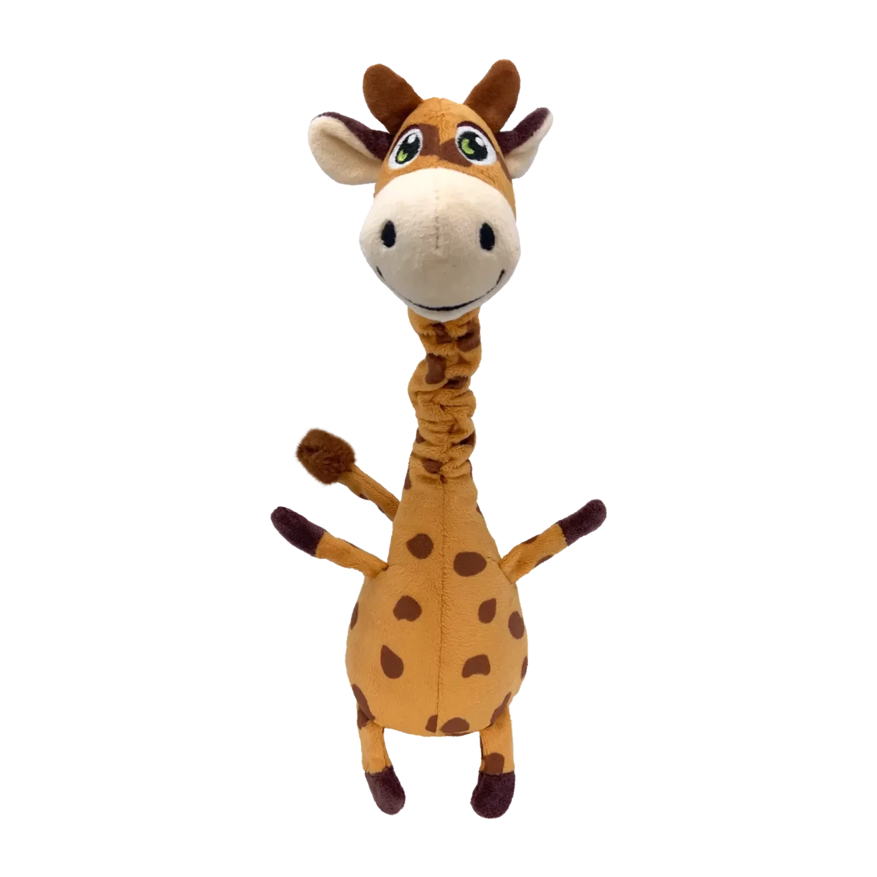 У KONG Shakers Bobz Giraffe є міцний, гнучкий шнур на його хиткій шиї, який дає змогу йому кивати, запрошуючи бити його довге, гнучке тіло. Низькотональний писклявий звук подовжує час гри, а шар армування подовжує задоволення від смикання, несення і кидання.