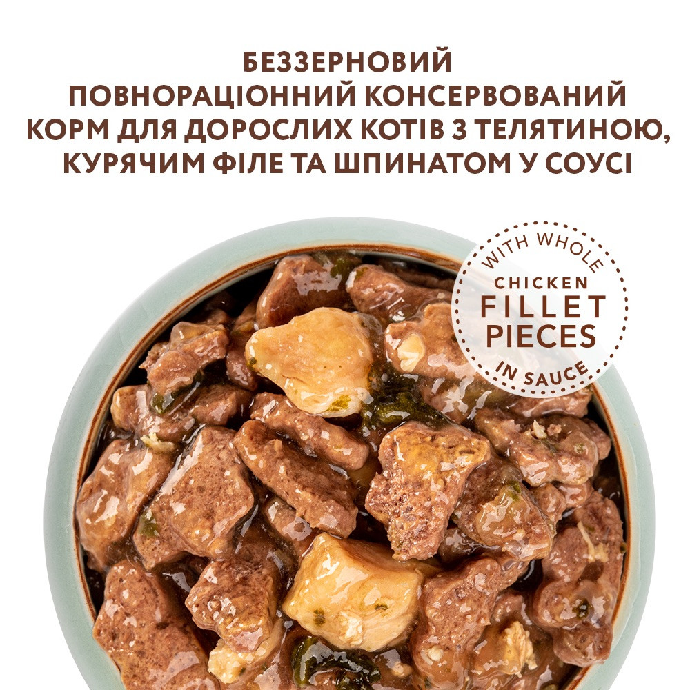 Беззерновий вологий корм для котів Оптіміл Optimeal з телятиною, курячим філе та шпинатом у соусі (блок 12 шт x 85 г)