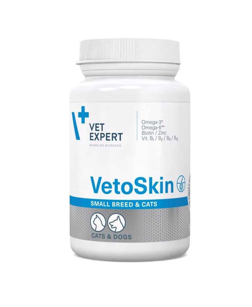 VetoSkin Small breed & cat (ВетоСкін) – харчова добавка для котів і собак із захворюваннями шкіри, які проявляються у вигляді сухої та тьмяної шерсті, випадінні шерсті та лущенні шкіри. Збалансований рівень омега-омега кислот містить весь необхідний склад для покращення функцій шкіри. Омега-6 жирні кислоти , такі як лінолева кислота (ЛК) і гамма-ліноленова кислота (ГЛК), підтримують водний баланс шкіри. Вони слугують будівельними блоками керамідів, які утворюють спеціальну прокладку в позаклітинному просторі, щоб запобігти витоку втрати води між клітинами епідермісу. Це допомагає запобігти сухості шкіри, забезпечуючи достатній рівень зволоженості та еластичності. Найкращими джерелами Омега-6 жирних кислот є олія огірочника та олія примули вечірньої.