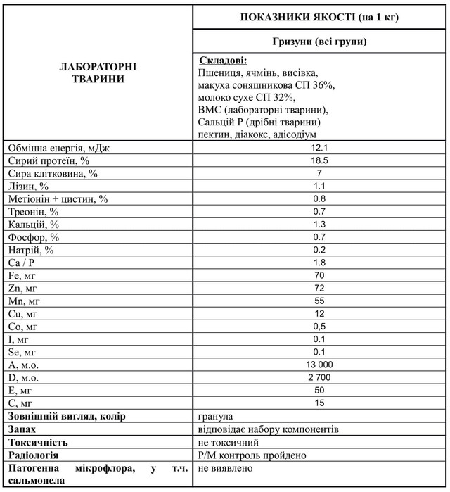 Комбікорм Віта Лабораторні тварини – 100% корм, готовий для згодовування тварин відповідного виду/фізіологічного періоду, не потребує додаткового збагачення чи балансування іншими компонентами. Складається з рослинних, тваринних, біологічно активних компонентів згідно встановленої рецептури.