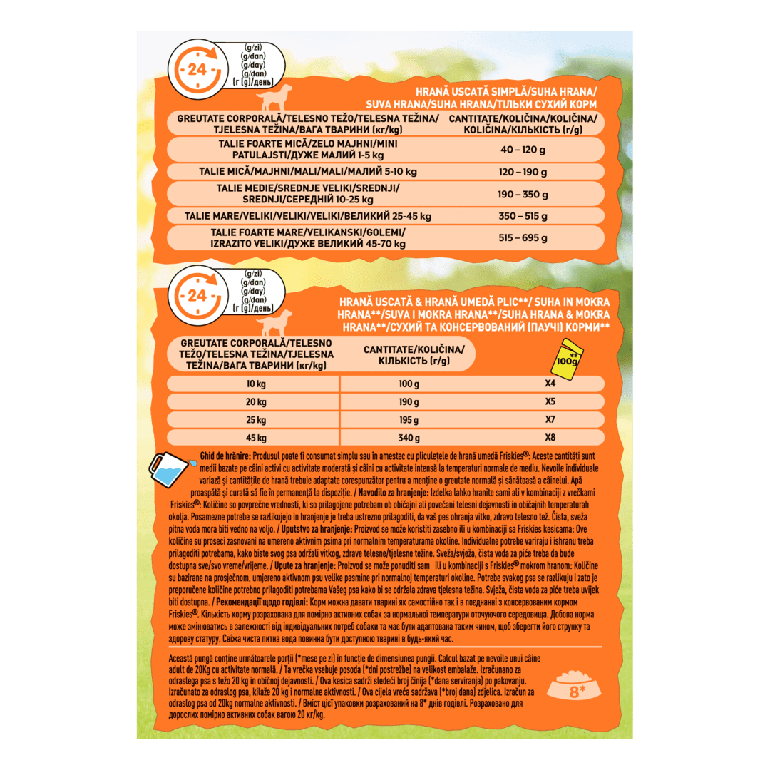 Корм можна давати тварині як самостійно, так і в поєднанні з консервованим кормом Friskies®. Кількість корму розрахована для помірно активних собак за нормальної температури оточуючого середовища. Добова норма може змінюватися в залежності від індивідуальних потреб собаки та має бути адаптована таким чином, щоб зберегти його струнку та здорову статуру. Свіжа чиста питна вода повинна бути доступною тварині в будь-який час.