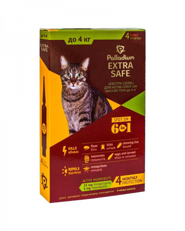 Краплі Extra Safe (Екстра Сейф) від 6-ти видів паразитів для котів вагою до 4 кг упаковка №4 піпетки Palladium