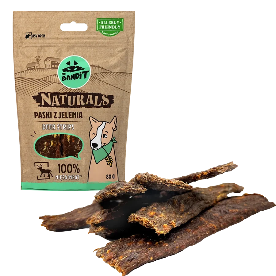 Mr. Bandit Натуралс смужки з оленя для собак – унікальні ласощі, які обов'язково порадують вашу собаку. Кожна смужка з оленя складається з 60% м'яса оленя, а решта 40% – субпродукти, хрящі та кістки оленя. Це відмінне джерело автентичного смаку і поживної цінності, яке забезпечить вашому вихованцеві не тільки задоволення від їжі, але і цінними поживними речовинами.