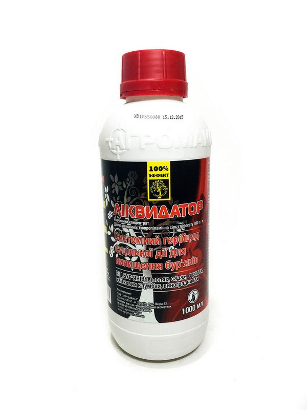 Ліквідатор 1 л — гербіцид загальної дії для знищення однорічних та багаторічних бур'янів при вирощуванні овочевих культур: кукурудза, пшениця, ячмінь, ріпак, диня, кавун, соя, конюшина. Повністю знищує всі види однорічних і багаторічних злакових і дводольних бур'янів, у тому числі такі злісні багаторічні: пирій повзучий, осот польовий, березка польова, хвощ польовий. Препарат Ліквідатор швидко розподіляється по всіх органах бур'янів, в тому числі і до кореневої системи.