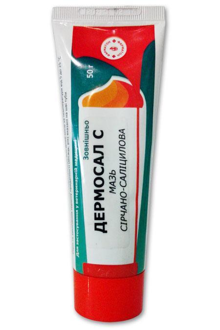 Мазь Дермосал-С (50 г) – для лікування захворювань шкіри та копит: папіломатоз, загнивання стрілки та інші види гнилі рогів, у великої рогатої худоби, коней, овець, кіз.