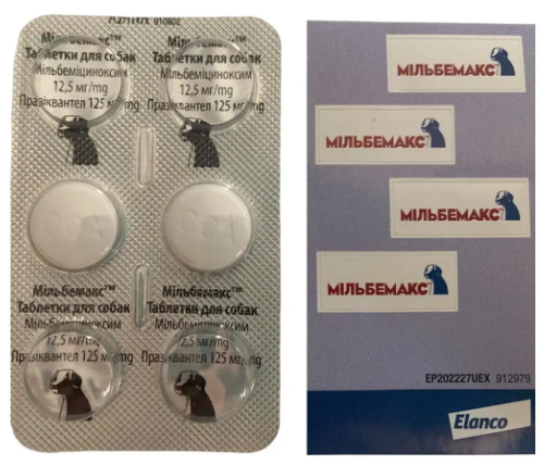 Мільбемакс таблетки для собак як активні речовини містять мильбеміцину оксид і празиквантел. Випускають препарат у двох модифікаціях: «Мільбемакс таблетки для цуценят і маленьких собак» з вмістом в одній таблетці мильбеміцона оксиду — 2,5 мг, празиквантелу — 25 мг і «Мільбемакс таблетки для великих собак» з вмістом мильбеміцу оксиду — 12,5 мг і празиквантелу — 125 мг/табл.