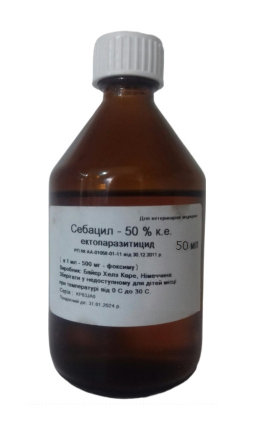 Для знищення коростяних кліщів (Psoroptes, Sarcoptes, Chorioptes), кусають і сисних вошей, рунцов овечих, бліх, а також личинок м'ясної мухи. Себаціл® 50% характеризується високою акарицидной та інсектицидної ефективністю одночасно з низькою токсичністю для ссавців. ВРХ (нелактуючі), вівці, свині.
