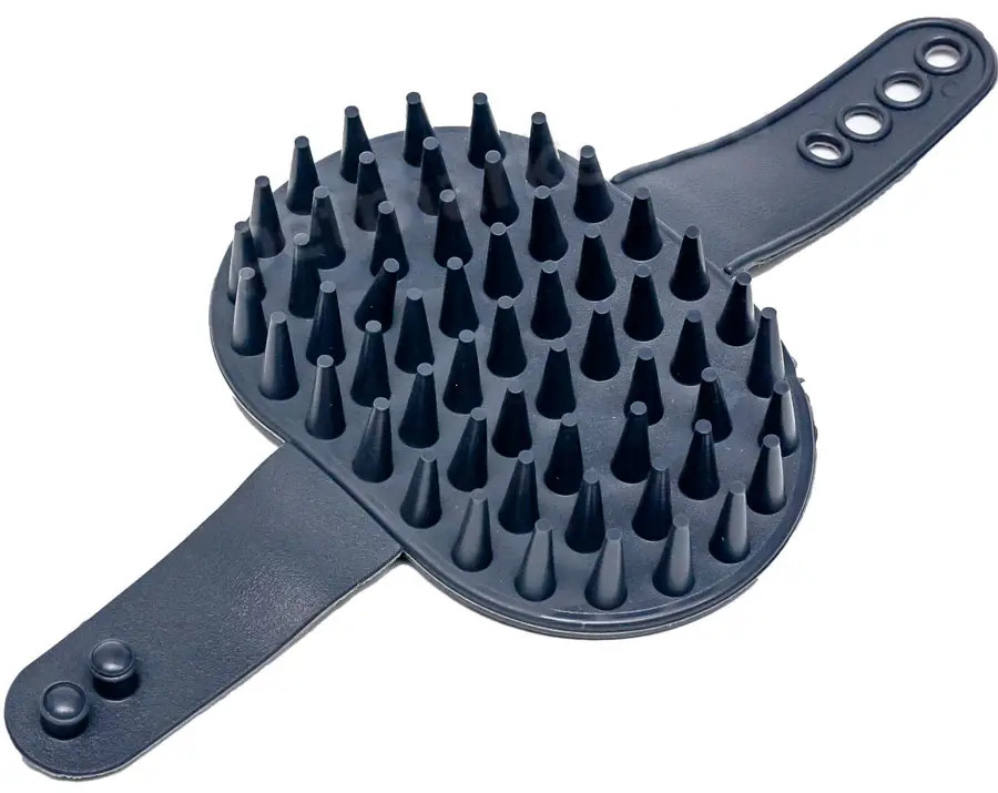 - Гумову щітку можна відрегулювати за розміром долоні за допомогою ремінця, на якому з одного боку зроблено кілька отворів, а з іншого боку знаходяться дві невеликі кобурні кнопки.