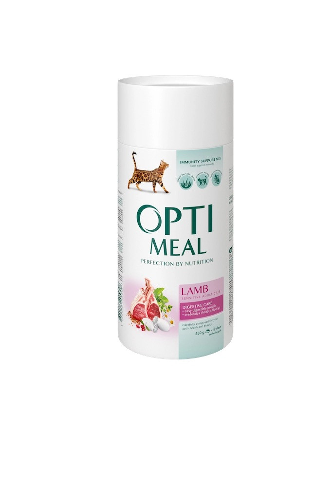- Унікальна рецептура для підтримки імунітету в сухому кормі Оптіміл Сенситив з ягням для кішки – це комплексна суміш корисних трав, ягід та природних антиоксидантів.