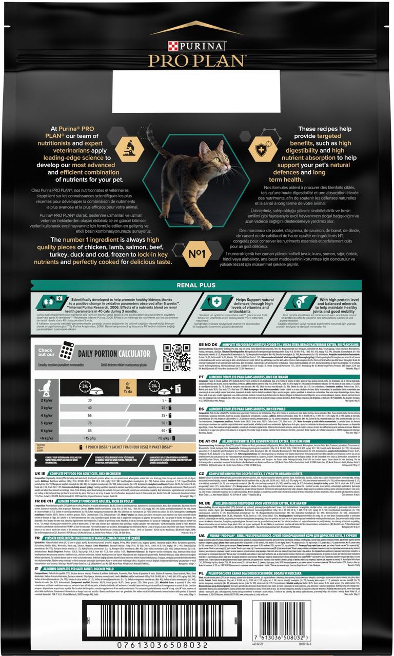 Сухий повнораціонний корм Purina Pro Plan Adult Renal Plus – корм для дорослих котів, який містить набір необхідних поживних речовин, вітаміни А, С та Е. Цей корм для котів містить Renal Plus, унікальну формулу, що сприяє здоров'ю нирок. Здорові суглоби та висока рухливість завдяки високому вмісту білка, який живить мускулатуру Вашого кота і допомагає йому зберігати оптимальну вагу та гарну форму. Підтримує здоров’я імунної системи завдяки високому вмісту антиоксидантів, таких як вітаміни C і E. Допомагає запобігати утворенню нальоту та зубного каменю завдяки спеціальній текстурі крокетів і особливим мінералам, які значно знижують ймовірність появи зубного нальоту.