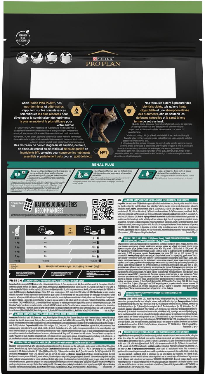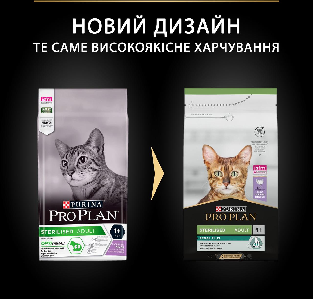 Purina Pro Plan Sterilised спеціально адаптований до знижених енергетичних потреб дорослих кастрованих котів і стерилізованих кішок. Корм забезпечує підтримування ідеальної кондиції, забезпечує нормальну регуляцію метаболізму глюкози та роботи сечовидільної системи. Корм Purina Pro Plan Sterilised, основним інгредієнтом якого є індичка, є повнораціонним збалансованим харчуванням із високими смаковими характеристиками, забезпечуючи кастрованого кота поживними речовинами та зберігаючи його здоров'я. Підтримує здоров'я сечовивідної системи; допомагає підтримувати оптимальну вагу; допомагає захистити зуби від утворення нальоту та зубного каменю. Sterilized (для стерилізованих котів і кастрованих котів. З куркою та індичкою).