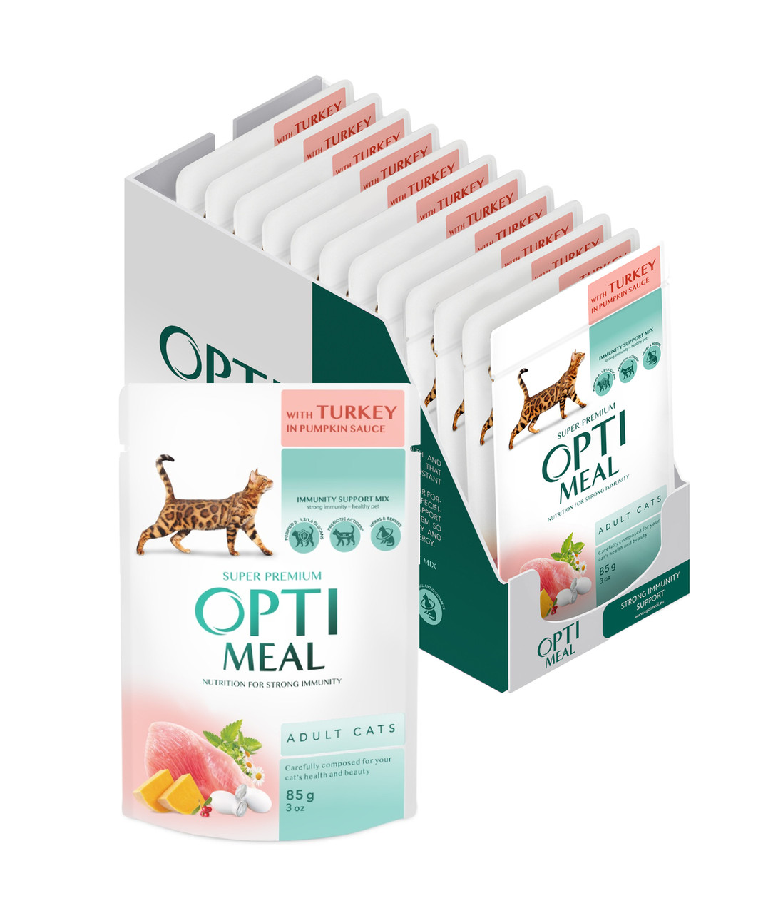 Optimeal Adult Cats Turkey in Pumpkin sauсe – повноцінний вологий раціон для улюбленців від 12 місяців, який містить м'ясо індички та соус з гарбуза. Паучі Оптіміл з індичкою в гарбузовому соусі для котів мають насичений смак та соковиту текстуру.