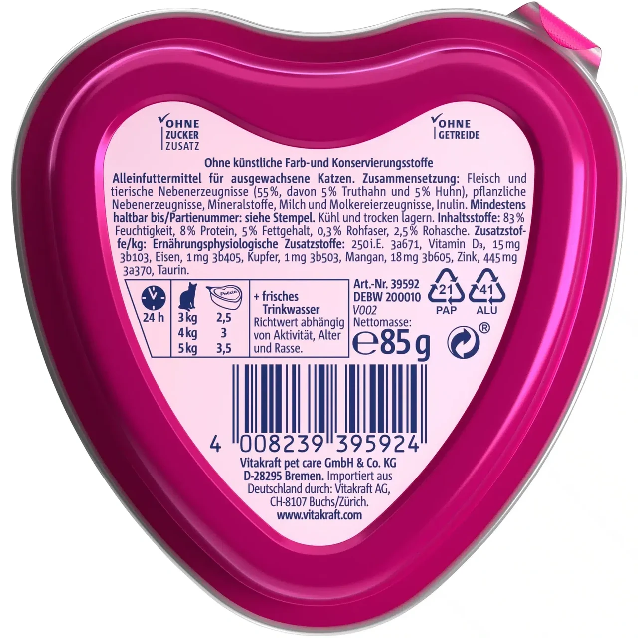 Повнораціонний вологий корм високої якості, у формі серденька. Узгоджений з харчовими потребами дорослих котів. Має неперевершений смак, завдяки шматочкам інгредієнтів, що легко розпізнати, та апетитному соусу. Без цукру, без консервантів та барвників.