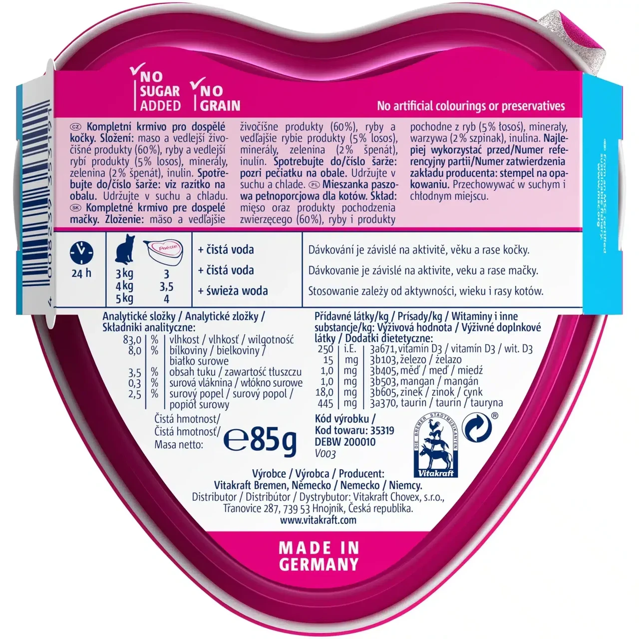 Інгредієнти: м’ясо та субпродукти тваринного походження 60%, риба та рибні субпродукти (5% лосося), мінерали, овочі (2% шпинат, інулін).