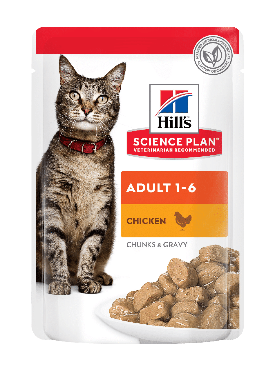 Вологий корм Hill's SCIENCE PLAN Adult рекомендовано для котів віком від 1 до 6 років. Зміцнює імунітет, підтримує здорове травлення та м’язову масу у котів.