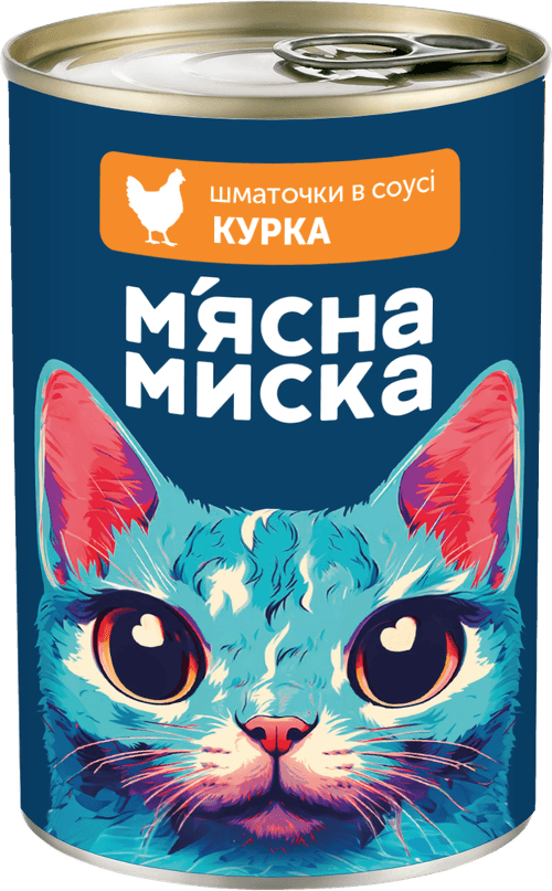 М'ясна миска – щоразу до блиску! М'ясні шматочки з куркою в соусі від М'ясна миска – це новий стандарт корму економ класу. Консерви для кішок М'ясна миска шматочки з куркою у соусі не є делікатесом. Це повнораціонний вологий корм, який готовий до щоденного та постійного годування вашого котика. Смачний та ароматний соус у складі продукту приваблює тваринку до споживання корму. Високий відсоток вмісту м'ясних інгредієнтів (76,5%) дозволяє легко конкурувати з їжею, приготовленою в домашніх умовах або «зі столу», але має стабільну промислову якість спеціалізованого petfood заводу. Консерви М'ясна миска для кішок випускаються в класичних банках зі спеціального харчового металу, завдяки чому корм може зберігатися до 48 годин, за які ви точно згодуєте його своєму улюбленцю.